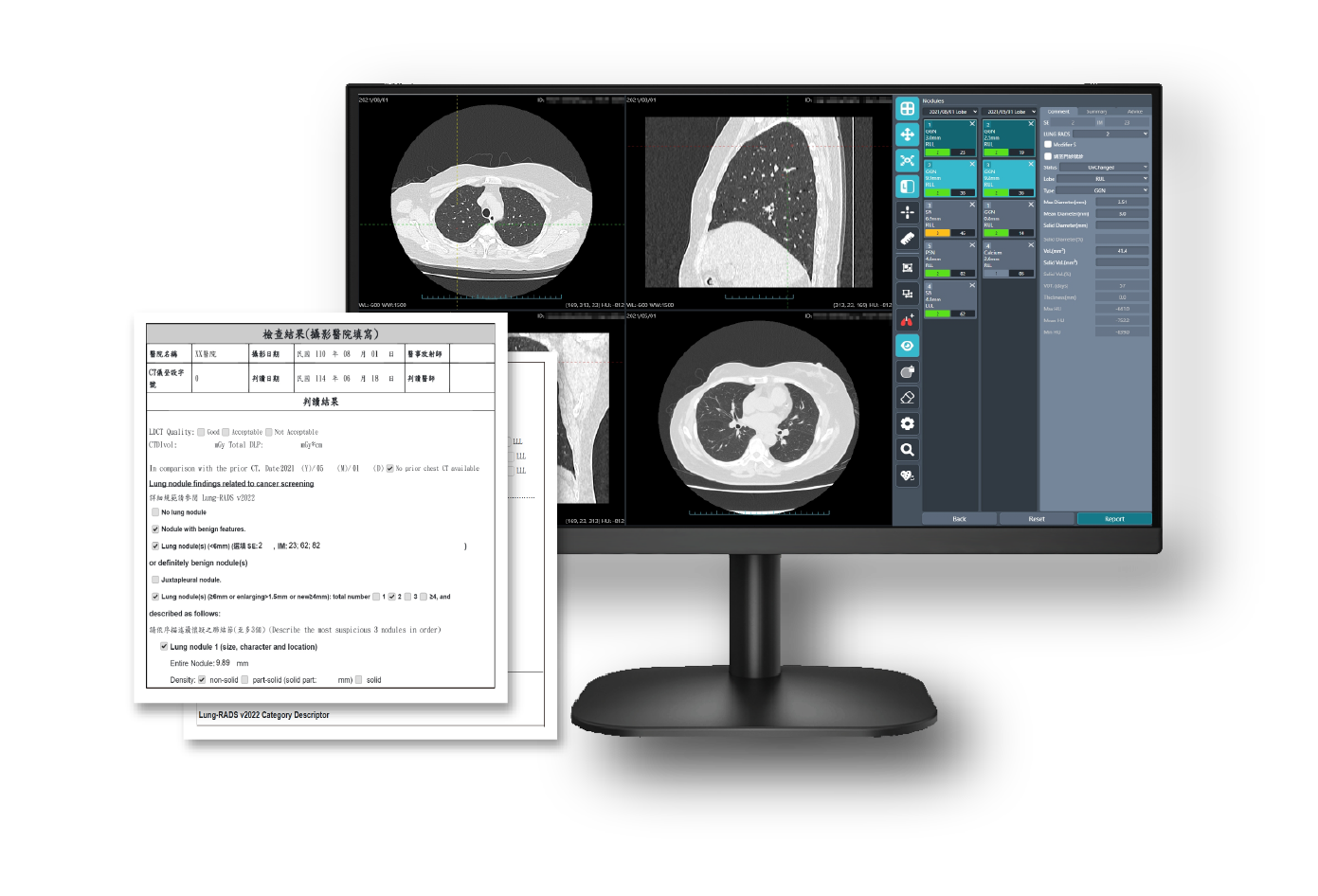 Ti-LUNG軟體是一款肺部電腦斷層決策支援系統,用於檢視、分析肺部電腦斷層影像,識別疑似結節區域和評估其良、惡性程度,提供肺部結結特徵和Lung-RADS分級,以提升醫師閱片效率,並快速產生符合臨床需求的診斷報告,增加工作效率。